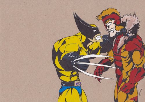 Wolverine "having words" with Sabretooth. I painted this in gouache on an A4 piece of manilla card. It was the result of hearing the cartoon theme song at a friend's house :)